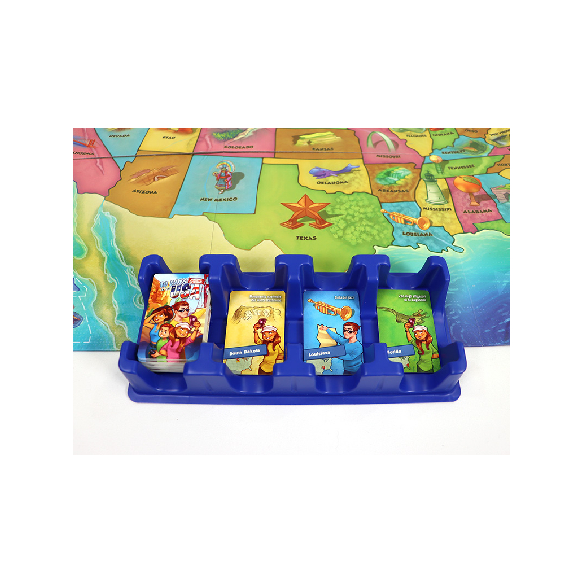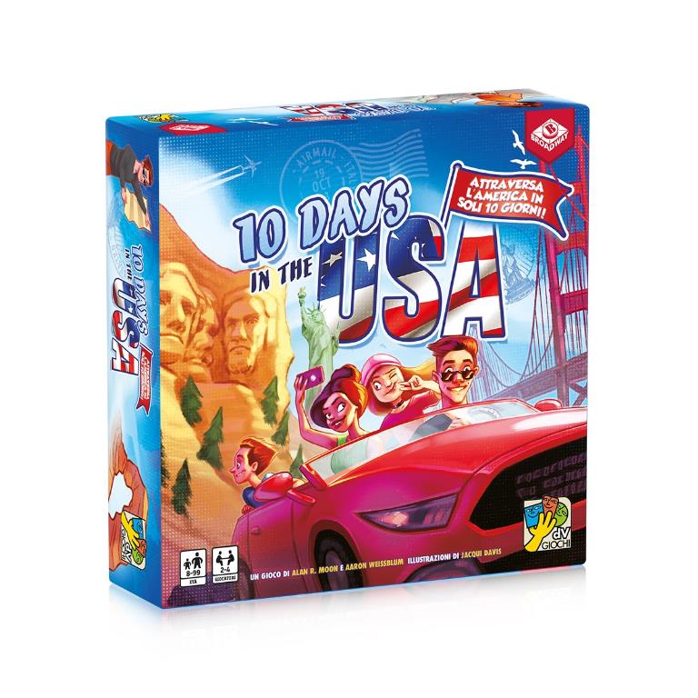 10 Days in the Usa Gioco da Tavolo di Gestione Mano e Connessioni per attraversare l’America in 10 Giorni! 10 Days in Usa gioco da tavolo per 2-4 giocatori dai 10 anni in su dalla durata di circa 30 minuti. Hai 10 giorni negli Stati Uniti. Viaggia per il paese in aereo, in auto e a piedi. Pianifica il tuo viaggio dall’inizio alla fine utilizzando tessere di destinazione e di trasporto. Con un po’ di fortuna e una pianificazione astuta, potresti riuscire a superare i tuoi compagni di viaggio. In 10 Days in the USA, i giocatori organizzano un viaggio da sogno negli Stati Uniti d’America! Visitate le attrazioni di questo affascinante paese muovendovi con ogni mezzo di trasporto e se necessario… anche a piedi! IL GIOCO IN BREVE:Pesca dal mazzo uno degli Stati o un mezzo di trasporto.Progetta il tuo itinerario, combinando al meglio le carte.Completa per primo il tuo viaggio di 10 giorni! Questo è il primo capitolo della serie “10 Days in”. Se stai cercando il Regolamento di 10 Days in the Usa puoi trovarlo in fondo alla pagina. SCOPO DEL GIOCO 10 DAYS IN THE USA L’obiettivo del gioco 10 Days in the USA è scegliere i migliori mezzi di trasporto per viaggiare da uno Stato all’altro e completare così il tuo itinerario. Organizza un viaggio da sogno negli Stati Uniti d’America! Per maggiori informazioni sul gioco visita la pagina ufficiale dell’editore DvGiochi! oppure dai un’occhiata alla pagina dedicata su Bgg! COME SI GIOCA AL GIOCO DA TAVOLO 10 DAYS IN THE USA Le regole del gioco 10 Days in the Usa sono molto semplici: ci sono 50 tessere degli stati, 10 tessere aereo colorate e 6 tessere auto. I giocatori girano le tessere una alla volta, le esaminano e le posizionano nelle 10 “giornate” del loro vassoio tessere, in qualsiasi ordine. Poi, a turno, prendono una tessera da una delle tre pile scoperte o da una pila coperta. La nuova tessera può sostituire una tessera nel loro vassoio, con quella tessera (o la tessera disegnata non utilizzata) scartata su una delle pile scoperte. In alternativa, i giocatori possono scambiare due tessere nel loro vassoio. Quando un giocatore ha tutte le sue giornate collegate correttamente, vince il gioco. Connessioni di viaggio:A piedi – le tessere degli stati confinanti possono essere collocate una accanto all’altra.In auto – gli stati possono essere collegati guidando attraverso un terzo stato che li confina entrambi (la tessera auto è posizionata tra di essi).In aereo – due stati dello stesso colore possono essere collegati da un aereo dello stesso colore posizionato tra di essi. Il primo giocatore a completare un itinerario di dieci giorni (10 Days), vince la partita! Davvero non ti basta? Scopri tutti gli articoli disponibili per giochi 10 Days! Contenuto 50 Carte Stato 16 Carte Mezzo di Trasporto 4 Portacarte 1 Vassoio portamazzi 1 Plancia di gioco 1 Regolamento Sleeves 66 In Aggiornamento