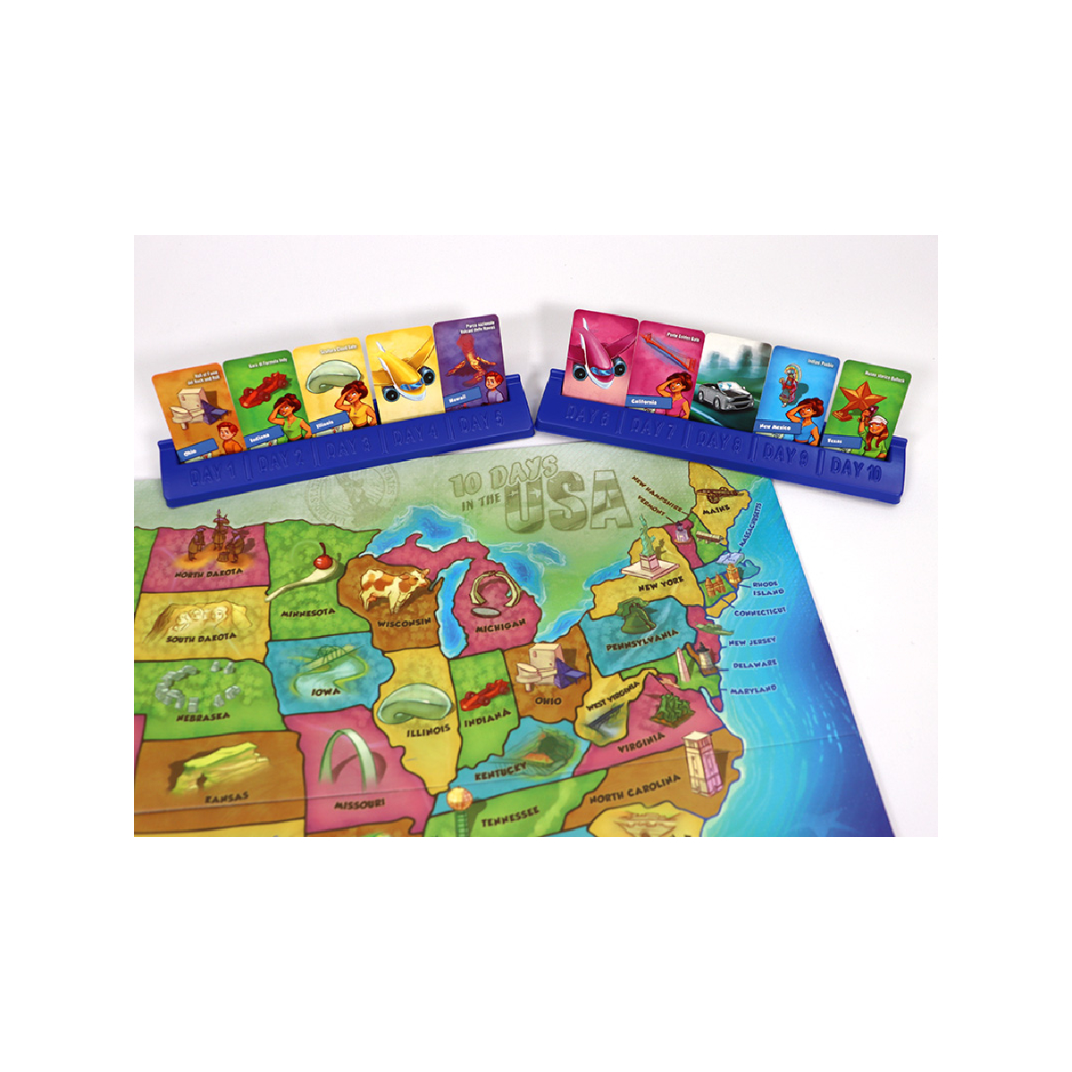 Nel gioco 10 Days in the Usa organizza un viaggio da sogno scegliendo le tessere per creare un percorso attraverso una mappa degli Stati Uniti d’America.