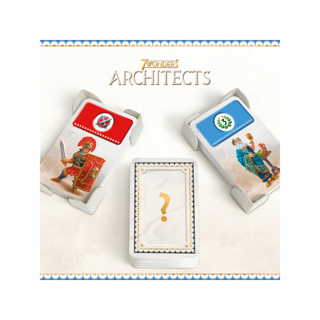 7 Wonders Architects gioco da tavolo stand alone Costruisci una meraviglia così grandiosa da lasciare il segno nella Storia! 7 Wonders Architects gioco da tavolo veloce, chiaramente ispirato al suo capostipite 7 Wonders, ma con regole più semplici e strategie diversificate. Usa la sua capacità per costruire la tua meraviglia, fare scoperte scientifiche, o combattere i tuoi vicini! COME SI GIOCA A 7 WONDERS ARCHITECTS 1) Scegli una carta tra le tre disponibili.2) Giocala di fronte a te.3) Usa la sua capacità per costruire la tua meraviglia, fare scoperte scientifiche, o combattere i tuoi vicini! Una partita al gioco da tavolo 7 Wonders Architects si svolge in una serie di turni. Nel proprio turno, il giocatore sceglie una carta tra le tre disponibili: queste carte raffigurano diversi personaggi che lo aiuteranno a raccogliere le risorse necessarie a costruire la sua Meraviglia, fare scoperte scientifiche o addirittura combattere i suoi vicini. Il gioco termina quando una Meraviglia è interamente costruita. Ottieni il punteggio più altro per vincere la partita. Costruisci la tua meraviglia stadio dopo stadio Osserva la tua meraviglia prendere forma durante la partita e usa i suoi effetti a ogni nuovo stadio che costruisci. Scegli e gioca Nel tuo turno, scegli una tra le tre carte disponibili e applica immediatamente il suo effetto. Le tue risorse, le monete, le scoperte scientifiche e la forza militare guideranno la tua civiltà verso la vittoria! Il gioco 7 Wonders Architects è inoltre: Un gioco veloce con regole semplici, perfetto per chi è alle prime armi con i giochi da tavolo. Intrattenimento per tutti nell’universo di 7 Wonders, il gioco da tavolo più premiato al mondo. Preparazione facile e veloce, grazie ai diversi portacomponenti inclusi nella scatola. Giocabile dagli 8 anni in su, da 2 a 7 giocatori. Adatto ai giocatori daltonici. Per venire incontro a tutti i tipi di daltonismo, a ogni colore usato nel gioco corrisponde un simbolo. Davvero non ti basta? Scopri tutti gli articoli disponibili per 7 Wonders! Contenuto 235 Carte 7 Meraviglie 7 Portacarte 8 Porta Componenti 50 Segnalini Sleeves 235 60×100
