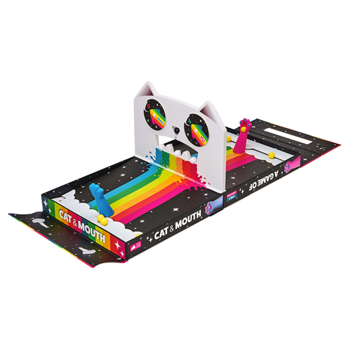 Dai creatori di Exploding Kittens, un gioco calamitoso, flipperoso e superspietato che crea dipendenza. Lanciate palline volanti con delle magnetiche Zampe Fionda! In A Game of Cat & Mouth raccogliete velocemente qualsiasi pallina si trovi dal vostro lato della plancia e lanciatela. Per lanciare una pallina inseritela nella Zampa Fionda, tiratela all’indietro e rilasciatela. Potete lanciare qualsiasi pallina gialla o bianca verso l’altro lato della plancia. Lanciate il più velocemente possibile! COME SI GIOCA A GAME OF CAT & MOUTHPer preparare il gioco, si apre la scatola sul tavolo, si posiziona lo schermo divisorio a forma di “testa di gatto” in posizione verticale al centro della tavola, si colloca la pallina nera del “naso” al centro del viso del gatto, si sistemano le tre palline bianche dei “denti” nella bocca del gatto, si dividono le otto palline gialle tra i due giocatori e si blocca la zampa di gatto magnetica in posizione su ogni lato del tabellone di gioco. In una mano, si utilizza la zampa di gatto per lanciare le palline attraverso la bocca del gatto verso il tuo avversario, oppure si mira al naso e ai denti per farli cadere. Non appena tutte le palline di un colore – la pallina nera, le tre palline bianche o le otto palline gialle – si trovano da una parte del tabellone, la mano termina e l’altro giocatore segna un punto. Si resetta il tabellone e si ricomincia a lanciarsi palline l’uno contro l’altro!” Davvero non ti basta? Scopri tutti gli articoli disponibili per Exploding Kittens! Contenuto 1 Scatola gioco 2 Zampe-Racchette 3 Palline 1 Regolamento Sleeves – Non Previste