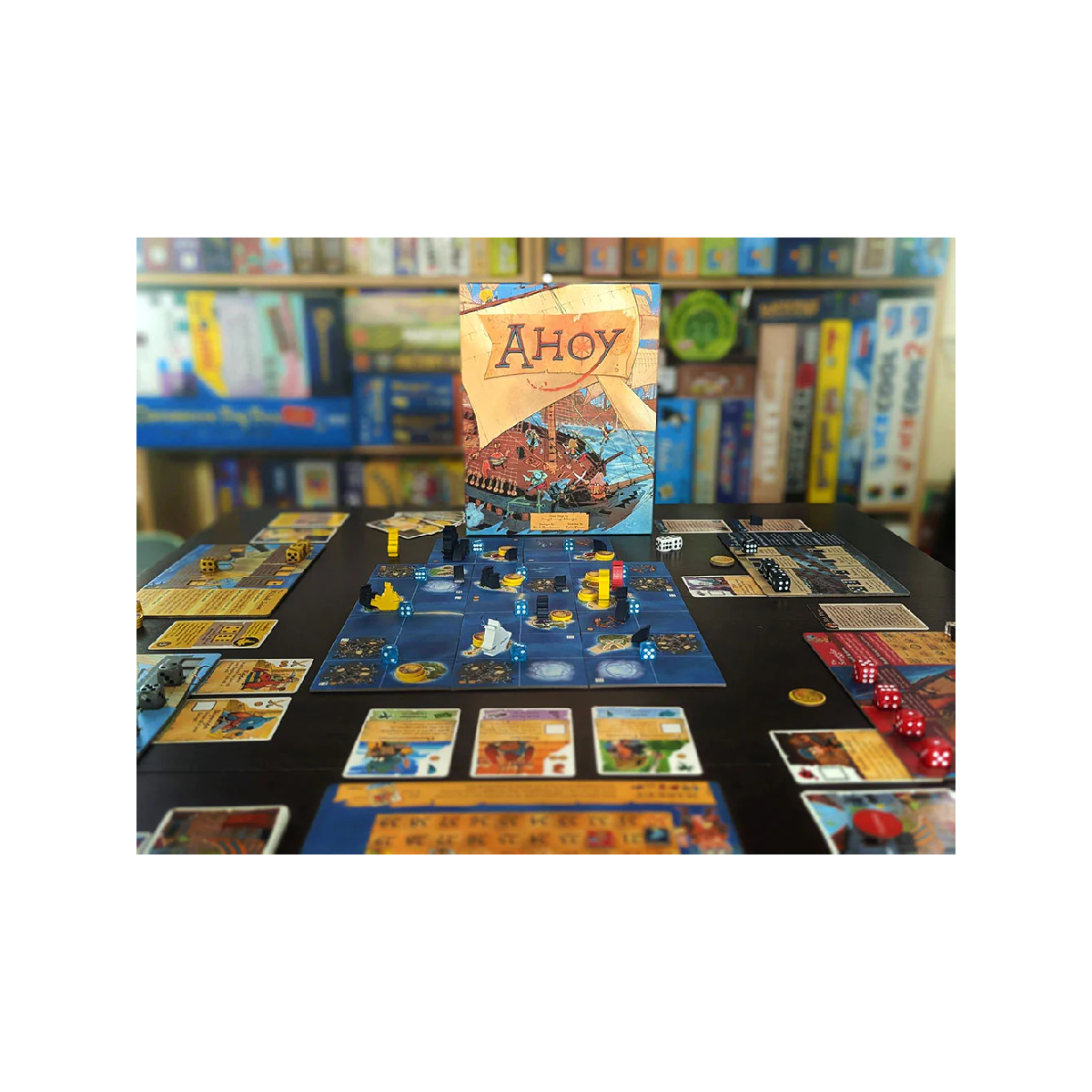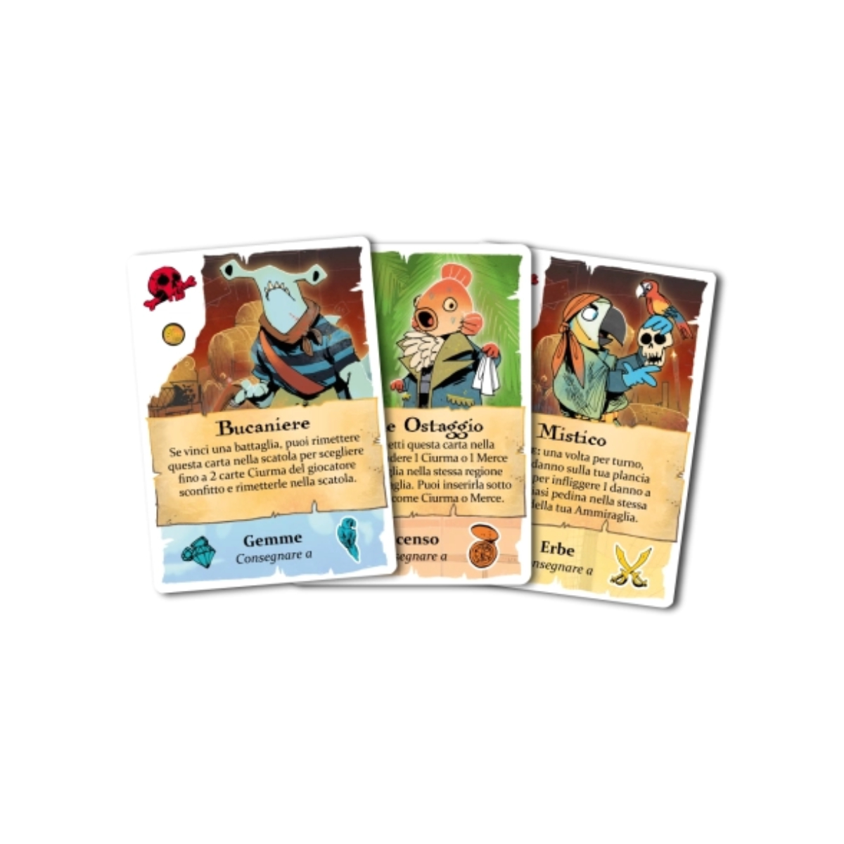 Ahoy Gioco da Tavolo in cui Diverse Fazioni Lottano per la Fama sui Mari! Ahoy gioco da tavolo per 2-4 giocatori dai 14 anni in su dalla durata di circa 45-75 minuti. Ahoy è un gioco leggermente asimmetrico in cui due o quattro giocatori assumono i ruoli di avventurieri e soldati alla ricerca di Fama sui mari. Con lo sviluppo dello stesso team che ti ha portato Root e Oath, Ahoy offre un gameplay profondo e interattivo in un design veloce e facile da imparare, con un ambiente colorato reso vivo dalle splendide illustrazioni di Kyle Ferrin. Rinforza la Ciurma Otterrai fantastici poteri reclutando nuovi membri per la tua Ciurma. Esplora le vastità dei Mari Crea un’unica mappa piena di tesori, correnti impetuose e pericolosi relitti unendo le prestigiose tessere a due livelli. Muovi, esplora e dai battaglia. Se stai cercando il Regolamento di Ahoy puoi trovarlo in fondo alla pagina. SCOPO DEL GIOCO AHOY Nel gioco da tavolo Ahoy sarete contrabbandieri e soldati, esploratori dei Mari e pirati con un solo obiettivo: ricerca di gloria e ricchezza! Ogni round tirerai i dadi e li posizionerai nella tua plancia fazione per svolgere azioni uniche. Vinci la partita ottenendo Fama attraverso il controllo delle regioni e la consegna di merci. Per maggiori informazioni sul gioco visita la pagina ufficiale del distributore italiano Ms Edizioni! oppure dai un’occhiata alla pagina dedicata al gioco su Bgg! o ancora alla pagina del produttore ufficiale Leder Games! COME SI GIOCA AL GIOCO DA TAVOLO AHOY Le regole del gioco Ahoy sono complesse ma piacevoli da apprendere: un giocatore controlla lo Squadrone Granfauci, una compagnia di squali e i loro amici dentuti, che pattugliano queste acque e mantengono l’ordine con colpo e spada. Un altro giocatore controlla l’Unione dei Molluschi, un’alleanza di creature marine e i loro compagni d’armi, che lottano per riconquistare la loro dimora ancestrale. Nei giochi con più persone, alcuni giocatori controllano i 2 Contrabbandieri, capitani maverick ribelli che superano i blocchi per contrabbandare lussi ed essenziali, consegnandoli a coloro che ne hanno più bisogno…o che pagano di più. Esplora i mari Mentre giochi, creerai una mappa unica piena di tesori, relitti pericolosi e potenti correnti marine, utilizzando piastrelle regionali deluxe a doppio strato. Solcate i Mari alla ricerca di Fama nel ruolo di una delle quattro intrepide fazioni: ogni round ottieni Fama in base alle regioni che controlli, ovvero quelle dove hai la maggioranza di pedine con squali e molluschi; con i contrabbandieri ottieni Fama consegnando Merce, anche se questo aumenterà la ricchezza delle regioni, attirando così l’attenzione dello Squadrone e dell’Unione. Squadrone Granfauci ” Noi squali puliamo i cannoni e cavalchiamo le onde. Intorno a noi, il nemico trama e si nasconde. Ma quando lo troviamo, cosa faremo? Lo porteremo a bordo e lo cucineremo. Le fauci affilate, la tavola pronta. Mangiarvi il cuore, molluschi, è tutto ciò che conta! “ L’Unione dei Molluschi ” C’era una volta uno splendido mare, dove tutti eran liberi di navigare. Poi son arrivati e le navi han bruciato. Il rum è finito! Ci hanno incatenato. Ma presto vedrete, noi siamo l’Unione! Siam chele e tentacoli, portiam rivoluzione! “ I Due Contrabbandieri: ” Sulla bocca di tutti, il mio nome è veloce. Non ti senti al sicuro? Allora abbassa la voce. Non ti servirà spada né barile di rum. Prenderò i tuoi dobloni, poi mi trovi da Scumm. “ Davvero non ti basta? Scopri tutti gli articoli disponibili per giochi di Leder Games! Contenuto 4 Guide Tascabili 12 Tessere Regione 4 Plance Giocatore 4 Pedine Ammiraglie 10 Pedine Pattuglie 3 Pedine Fortezze 1 Pedina Cutter 1 Pedina Cannoniera 17 Dadi Azione 11 Dadi Ricchezza 2 Dadi BattagliaCarte 30 Carte Mercato 12 Carte Piano 1 Carta Primo Giocatore 2 Carte Riassuntive Squadrone Granfauci 2 Carte Riassuntive Contrabbandieri 25 Segnalini Danno 20 Segnalini Oro 20 Segnalini Compagno 1 Tracciato Fama 4 Indicatori Fama 4 Indicatori Promessa 4 Indicatori Ricompensa 1 Regolamento Sleeves 47 63×89