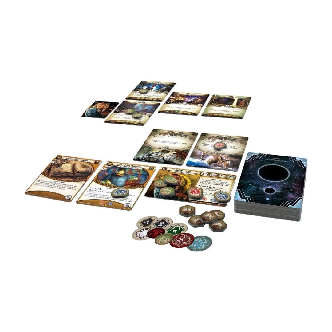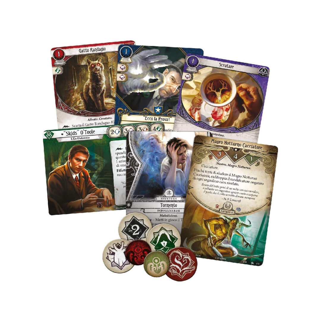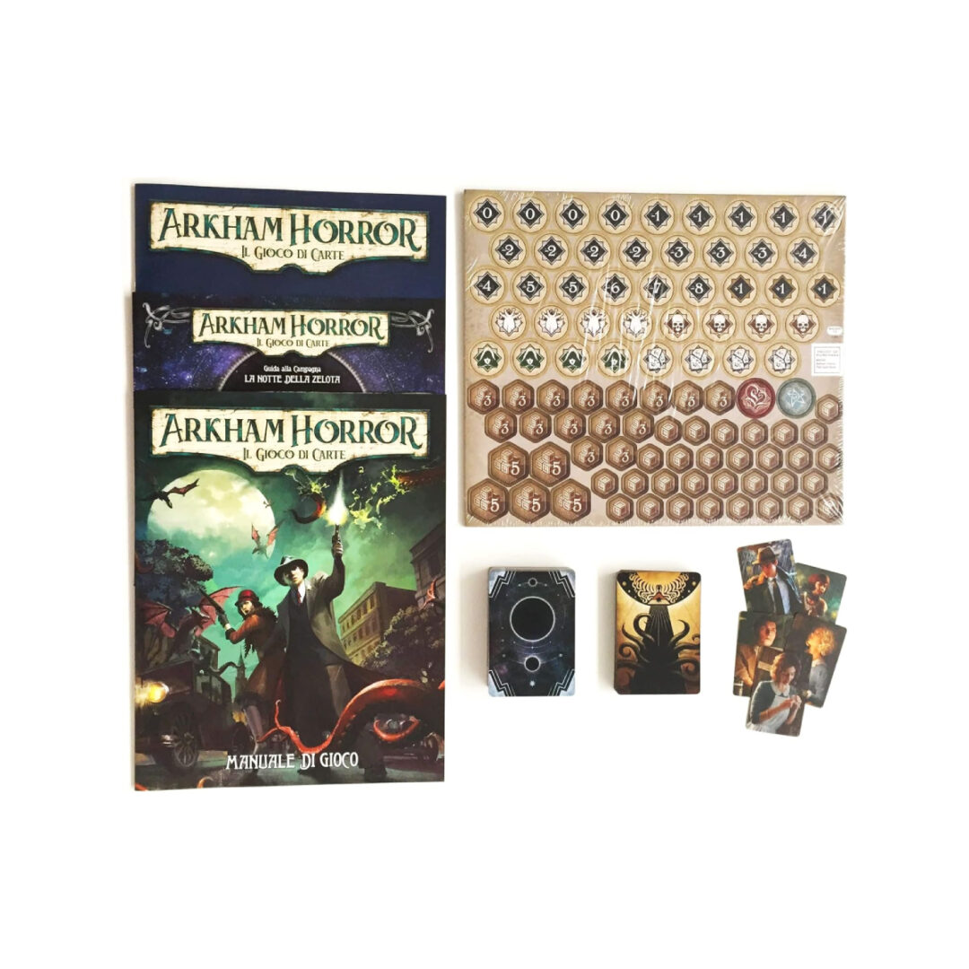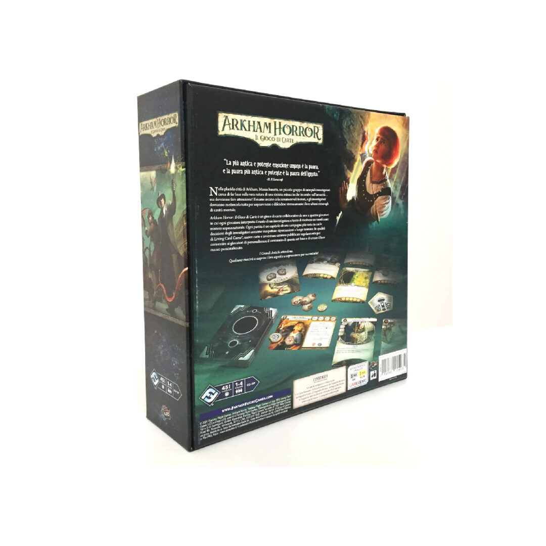 Nella placida città di Arkham, Massachusetts, un piccolo gruppo di intrepidi investigatori cerca di far luce sulla vera natura di una sinistra minaccia che incombe sull’umanità… ma dovranno fare attenzione! Il reame arcano cela innumerevoli terrori, e gli investigatori dovranno mettercela tutta per sopravvivere e difendere strenuamente i loro ultimi rimasugli di sanità mentale. Arkham Horror: Il Gioco di Carte è un gioco di carte collaborativo per uno o due giocatori in cui ogni giocatore interpreta il ruolo di un investigatore e tenta di risolvere un terrificante mistero soprannaturale. Con una seconda copia del set base, fino a quattro giocatori potranno partecipare al gioco tutti assieme. Ogni partita è un capitolo di una campagna più vasta in cui le decisioni degli investigatori avranno inaspettate ripercussioni a lungo termine. In qualità di Living Card Game, nuove carte e avventure saranno pubblicate regolarmente per consentire ai giocatori di personalizzare il contenuto di questo set base o di creare il loro mazzo personalizzato. Presumendo che fossi nel pieno possesso delle mie facoltà mentali l’esperienza di quella notte fu tale che nessun uomo ebbe mai a viverne una simile. Essa fu inoltre una conferma terrificante di tutto quel che avevo tentato di rifiutare in quanto frutto dei miti o dei miei sogni. –H. P. Lovecraft, L’Ombra Venuta dal Tempo PANORAMICA DEL GIOCO Arkham Horror: Il Gioco di Carte è un Living Card Game (LCG®) collaborativo in cui da uno a quattro investigatori indagano assieme per far luce sui misteri e sventare cospirazioni arcane, lottando allo stesso tempo con i demoni personali che infestano il loro passato. Ogni giocatore interpreta il ruolo di un singolo investigatore e costruisce un mazzo incentrato sulle capacità di quell’investigatore. Una serie di scenari interconnessi creerà una campagna narrativa che condurrà alla rivelazione graduale di un mistero più grande: in ognuno di questi scenari gli investigatori attraversano ed esplorano numerosi ambienti minacciosi, vanno in cerca di indizi che possano far progredire le indagini e cercano di sconfiggere le infide forze dei miti… o quanto meno di sfuggire ai loro attacchi. Man mano che la campagna procede, ogni investigatore accumula esperienza e sapienza: il personaggio potrà essere sviluppato in molti modi, aggiungendo nuove e potenti carte di alto livello al suo mazzo. Ma attenzione: più l’investigatore è esposto al mondo arcano, maggiore è il rischio di cedere alla follia. Oltre a sopravvivere e a svelare il mistero, gli investigatori dovranno proteggersi dalla morsa della pazzia che si stringe attorno a loro. Living Card Game Arkham Horror: Il Gioco di Carte è un Living Card Game® (LCG®) ed è possibile incrementare e personalizzare il gradimento e l’esperienza di gioco con l’acquisto di espansioni pubblicate a cadenza regolare. Tali espansioni possono introdurre nuovi investigatori, scenari o campagne aggiuntive, nonché nuove carte giocatore che aggiungeranno maggiore profondità e varietà ai mazzi degli investigatori. Sebbene lo svolgimento di una campagna sia la modalità che fornisce l’esperienza di gioco migliore, ogni scenario in essa contenuto può essere giocato come avventura indipendente. A differenza dei giochi di carte collezionabili, tutte le espansioni dei LCG prevedono una distribuzione fissa: i loro contenuti non sono mai casuali. Arkham Horror: Il Gioco di Carte, che unisce le tradizionali esperienze dei giochi di ruolo e dei giochi di carte in un’unica formula, assieme ai vostri amici diventerete dei personaggi che agiscono nella placida cittadina di Arkham, nel New England. Avrete molte doti, certo, ma sarete anche afflitti da qualche difetto. Forse avete esaminato un po’ troppo da vicino i brani del Necronomicon, e le sue parole continuano a tormentarvi. O forse provate l’impulso di insabbiare ogni traccia relativa ai più inquietanti fenomeni paranormali, ostacolando le indagini dei vostri stessi compagni nel tentativo di proteggere l’ignara tranquillità del resto della popolazione. O forse siete rimasti segnati a vita da un incontro con un culto di ghoul. A prescindere da cosa vi spinga ad agire e da cosa vi tormenti, sia i vostri punti di forza che i vostri punti deboli saranno rispecchiati nel vostro mazzo personale di carte, e queste carte saranno le risorse con cui lavorerete assieme ai vostri amici per fare luce sui misteri più terrificanti di questo mondo. SOPRAVVIVERE AI MISTERI PIÙ ORRIPILANTI Arkham Horror: Il Gioco di Carte, più di ogni altro gioco di carte che lo ha preceduto, è un miscuglio tra i tradizionali giochi di carte personalizzabili e le esperienze di gioco di ruolo. Interpreterete uno degli investigatori del gioco e personalizzerete il vostro mazzo di carte per rappresentare i vostri punti di forza e le vostre risorse personali. Tuttavia, come tutti gli investigatori di Arkham Horror LCG avrete anche una personalità ben distinta, che vi imporrà alcuni requisiti nella composizione del mazzo. Per esempio, se decidete di condurre le vostre indagini ad Arkham come l’Agente Federale Roland Banks (Scatola Base, 1), il vostro mazzo dovrà includere le carte .38 Speciale di Roland (Scatola Base, 6) e Copertura (Scatola Base, 7), assieme a una debolezza base, come Paranoia (Scatola Base, 97) o Amnesia (Scatola Base, 96). Queste carte specifiche dei personaggi sono una parte importante di ciò che Roland diventerà nel corso delle vostre avventure e non conteranno ai fini di determinare le dimensioni del vostro mazzo base. Il resto del vostro mazzo è composto da carte che appartengono a varie classi disponibili per i vostri personaggi. Usando di nuovo Roland come esempio, egli potrà usare le carte che appartengono alle classi del Guardiano o dello Studioso, nonché le carte Neutrali. In Arkham Horror LCG esistono cinque classi diverse, ognuna delle quali corrisponde a uno dei cinque investigatori del Gioc
