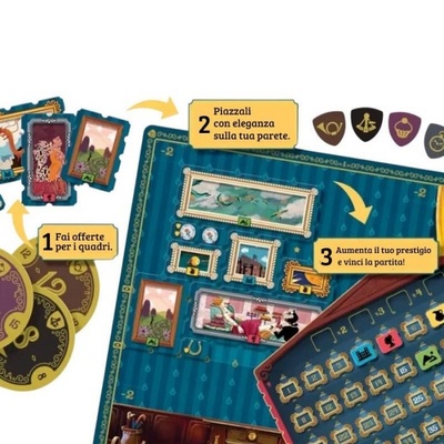 Art Society è un Gioco da Tavolo in Italiano di Mitch Wallace e Giochi Uniti per 2-4 giocatori, durata media 45 min, età 10+. Sei pronto a entrare nel mondo esclusivo dei collezionisti d’arte? In Art Society, un elegante gioco da tavolo di aste e collezionismo, dovrai costruire la galleria d’arte più prestigiosa della città, competendo con i tuoi rivali per acquisire le opere più ambite. Ma attenzione: le tendenze artistiche cambiano rapidamente, e ciò che oggi è un capolavoro potrebbe perdere valore domani! Come Si Gioca ad Art Society? Art Society è un gioco strategico per 2-4 giocatori, con una durata media di 30-60 minuti, adatto a partire dai 10 anni. Il tuo obiettivo è comporre la collezione d’arte perfetta, utilizzando meccaniche di aste competitive, set collection e piazzamento tessere. Fasi di Gioco: Fase d’Asta – Ogni round, i giocatori fanno offerte su nuove opere d’arte. L’abilità nel gestire il proprio budget sarà fondamentale per ottenere i pezzi più pregiati. Creazione della Galleria – Le opere vinte vengono piazzate nella tua galleria personale, dove dovrai organizzare le tele in modo strategico per massimizzare il valore della tua collezione. Evoluzione del Mercato – L’arte è imprevedibile! Le tendenze cambiano durante la partita, e alcuni dipinti potrebbero aumentare di valore, mentre altri potrebbero finire dimenticati in un deposito. Punteggio Finale – Al termine del gioco, i giocatori ottengono punti in base alla coerenza della loro collezione, ai bonus ottenuti e al valore finale delle opere acquisite. Strategia e Meccaniche Chiave Aste Tattiche – Pensa attentamente a quanto puntare per ottenere i pezzi migliori senza esaurire il budget. Set Collection – Raccogli opere dello stesso stile o periodo artistico per ottenere bonus e punti extra. Piazzamento Ottimale – Disporre i quadri nella propria galleria nel modo giusto può fare la differenza tra una collezione vincente e una deludente. Mercato Fluttuante – Adatta la tua strategia alle oscillazioni di valore delle opere nel tempo.