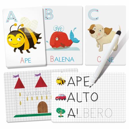 Leggere e a scrivere fin da piccoli! Con queste grandi lavagnette i bambini leggono e scrivono fin da piccoli! Da un lato scoprono i fonemi e li associano alla lettera corrispondente, dall’altro si abituano a scrivere ripassando le parole con il pennarello cancellabile. INTELLIGENZA PRINCIPALE Intelligenza linguistica AREA DI COMPETENZA Leggere e scrivere ETÀ 3-6 NUMERO DI GIOCATORI 1+ DURATA 30′ CONTENUTO 25 lavagnette double face; Pennarello scrivi e cancella ALTRI PLUS Con tante attività di pregrafismo e prelettura AVVERTENZE SPECIALI Nessuna BATTERIE Non necessarie ORIGINE Made in Italy