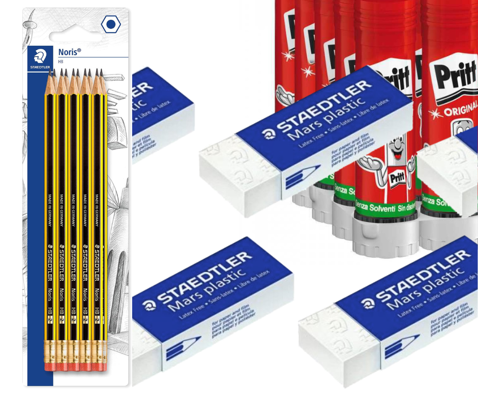 SUPER OFFERTA KIT CANCELLERIA SCUOLA Risparmiando, fai scorta degli articoli più usati e “consumabili”! il Kit comprende: 5 matite HB Staedtler Noris 3 gomme Staedtler Mars Plastic 526 50 4 colle Pritt stick 22g Acquista questo kit e risparmia prima che il prezzo cambi!