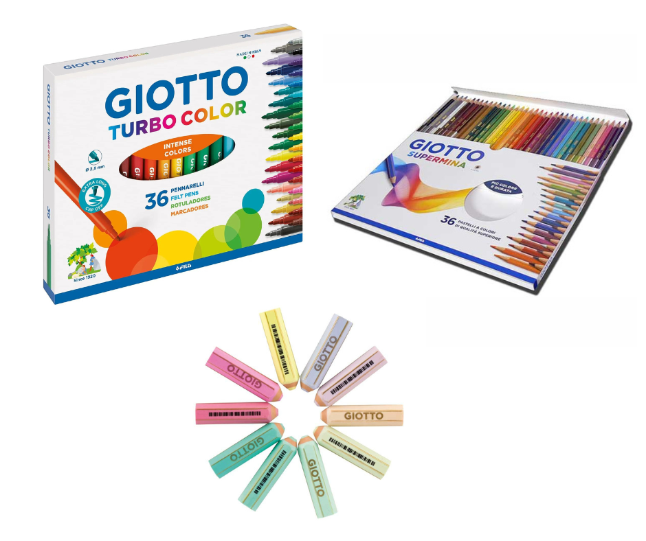 SUPER OFFERTA PER UN MONDO A COLORI Il kit comprende: 1 conf. 36 pennarelli Giotto Turbocolor 1 conf. 36 pastelli Giotto Supermina 1 gomma Giotto Happy pastel OMAGGIO Acquista questo kit, fai scorta e risparmia!