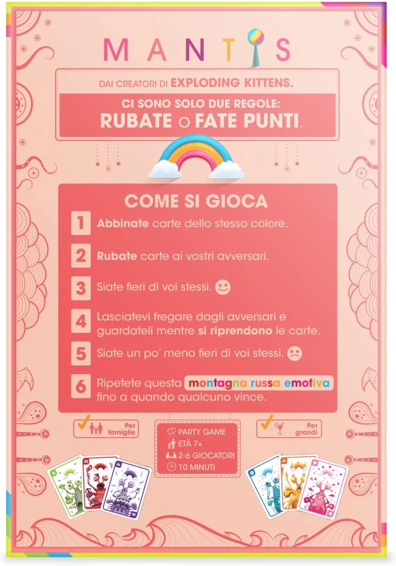 Ci sono solo due azioni disponibili: Rubare o Fare Punti. Con la sua semplicità e scorrevolezza di gioco, Mantis è pensato sia per i bambini che per gli adulti.