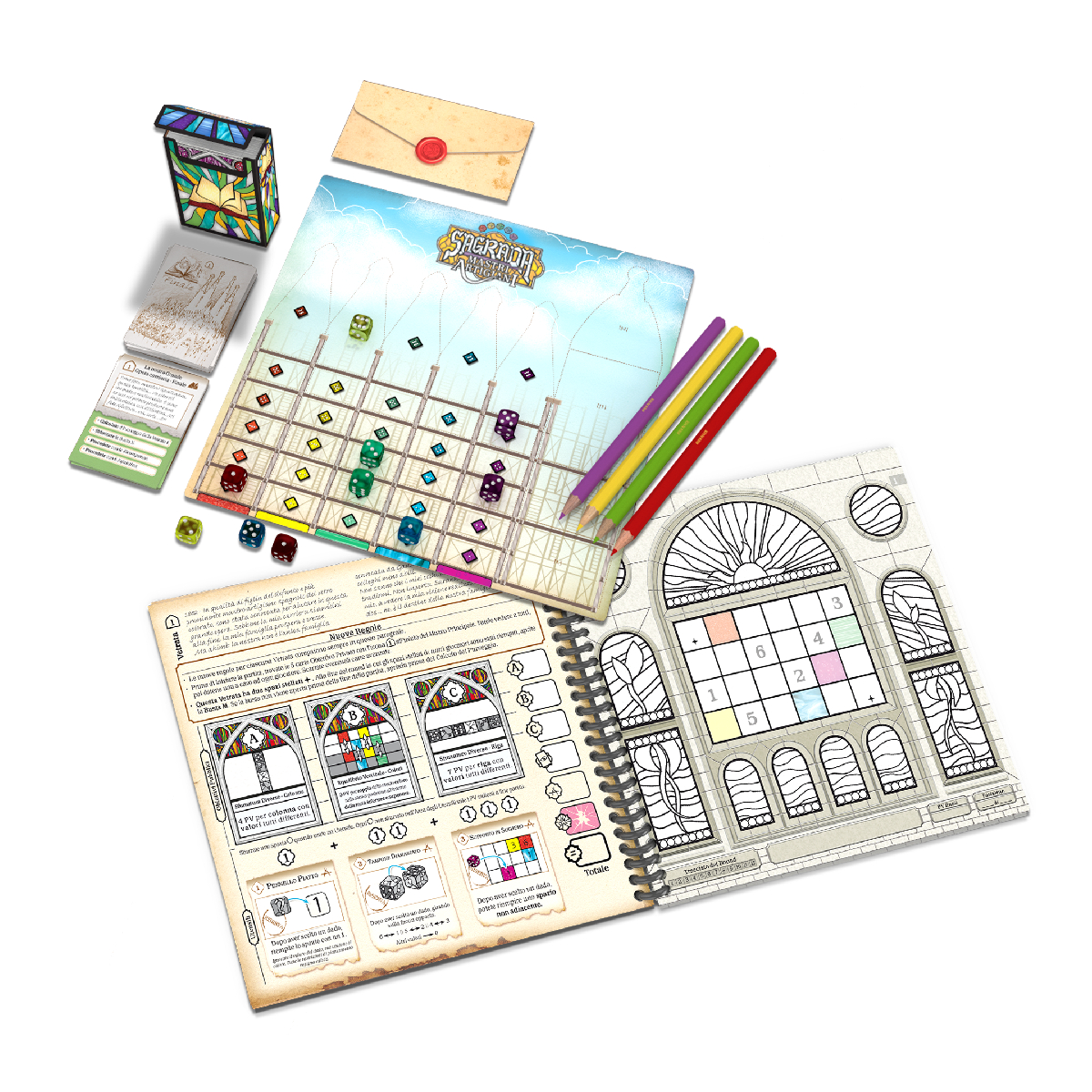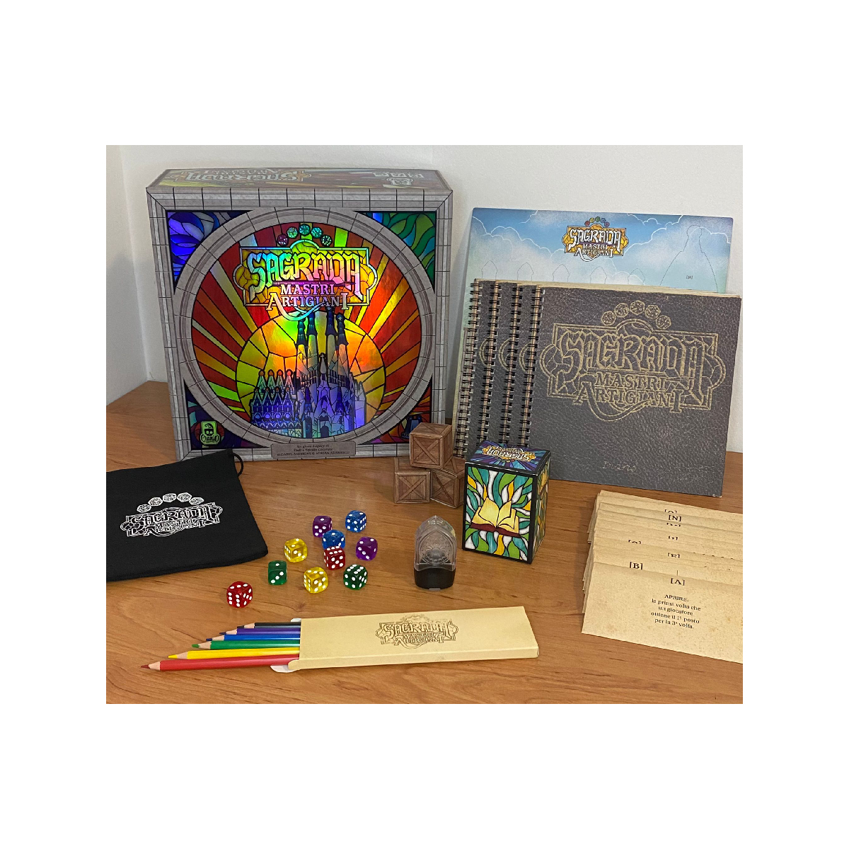 Mastri Artigiani – Sagrada Gioco da Tavolo Legacy di Dadi e Vetrate Colorate! Sagrada Artigiani gioco da tavolo per 2-4 giocatori dai 13 anni in su dalla durata di circa 60 minuti. Mastri Artigiani – Sagrada è un gioco autonomo, una campagna basata sul successo del gioco Sagrada – Un Gioco di Drafting di Dadi e Creazione di Vetrate. Tu e il tuo gruppo plasmerete la storia che si sviluppa attraverso più di 10 scenari unici: le vostre decisioni influenzeranno i futuri giochi grazie al Window Pattern Booster Pack incluso. NOTA IMPORTANTE: Questo gioco Legacy è pensato per essere giocato con gli stessi giocatori per tutta la durata della campagna. Sopravvivrà l’eredità dei vetri colorati della tua famiglia alla prova del tempo? In Sagrada – Mastri Artigiani gareggerai come famiglie rivali, ognuna narrando la costruzione delle vetrate della cattedrale durante una campagna che si estende attraverso le generazioni. Acquisisci potenti abilità e sblocca meravigliosi nuovi strumenti che porterai avanti attraverso la campagna… e oltre. Drafta attentamente i dadi e colora gli spazi in modo più astuto per soddisfare le restrizioni e gli obiettivi di ciascuna finestra, e sarai vittorioso! SCOPO DEL GIOCO MASTRI ARTIGIANI SAGRADA • Esplorate la campagna Legacy basata sul pluripremiato Sagrada!• Scegliete i dadi giusti e colorate le vostre vetrate!• Continuate a creare vetrate con Pacchetto Vetrate incluso!• Scoprite gli oltre 100 adesivi e dozzine di buste e scatoline sbloccabili! Artigiano: È un onore invitarti personalmente a unirti ai migliori artigiani in Spagna mentre costruiamo la più grande realizzazione architettonica della nostra epoca: La Sagrada Familia. COME SI GIOCA AL GIOCO DA TAVOLO MASTRI ARTIGIANI SAGRADA In Sagrada – Mastri Artigiani vi sfiderete come famiglie rivali di mastri artigiani, ciascuna incaricata della costruzione delle vetrate della cattedrale, nel corso di una campagna che abbraccia generazioni: ogni vetrata presenta nuovi elementi e sfide! Ottenete potenti abilità e sbloccate nuovi meravigliosi utensili in modo da averli a vostra disposizione per tutta la durata della campagna…e oltre!Scegliendo attentamente i dadi e colorando gli spazi nella vetrata, in modo da rispettare nel modo più astuto possibile le restrizioni e gli obiettivi, sarete infine voi ad emergere vittoriosi! Davvero non ti basta? Scopri tutti gli articoli disponibili per Sagrada! Se stai cercando il Regolamento di Sagrada Mastri Artigiani Errata puoi trovarlo in fondo alla pagina. Per maggiori informazioni sul gioco visita la pagina ufficiale dell’editore Cranio Creations Italia! oppure dai un’occhiata alla pagina dedicata su Bgg! Contenuto 4 Diari 6 Matite colorate 1 Temperino 1 Plancia Cattedrale 1 Mazzo Principale 3 Scatoline portacarte 1 Scatolina degli adesivi 10 Dadi colorati 1 Sacchetto 1 Regolamento 19 Buste sigillate 3 Cassettine in cartone 1 Pacchetto Vetrate + Tanto Materiale Segreto! Sleeves – Non Previste