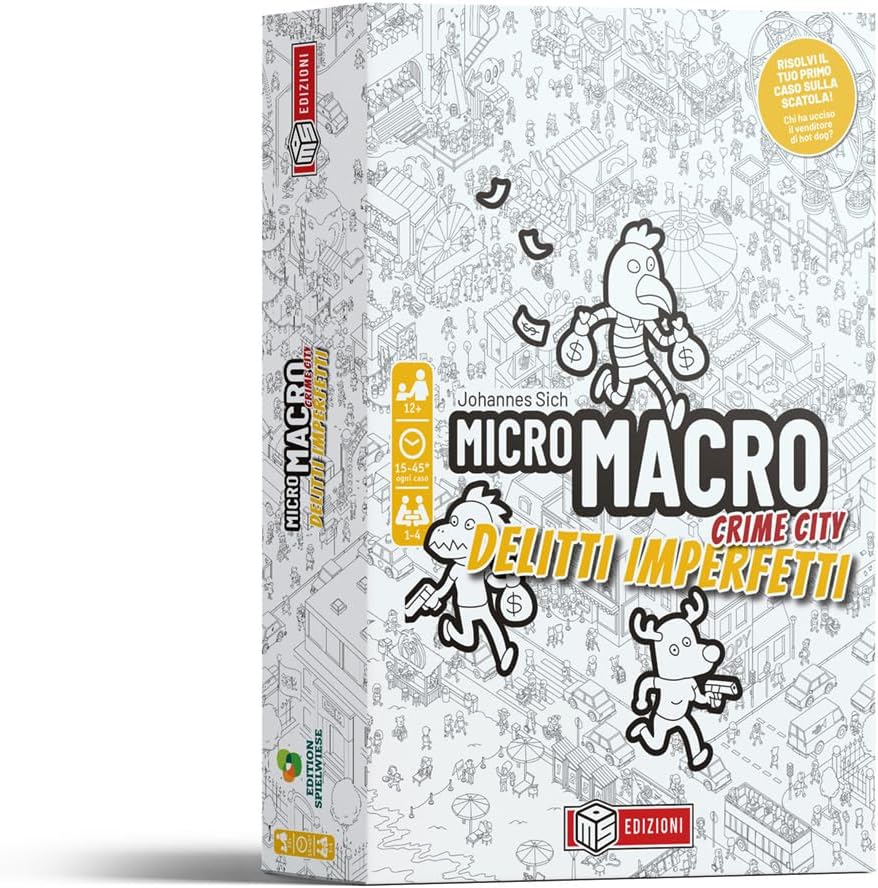 DELITTI IMPERFETTI è il QUARTO capitolo della serie MicroMacro: Crime City. Contiene una nuova mappa della città e 16 nuovi casi che non richiedono una copia dei capitoli precedenti per essere giocati. Benvenuti a MicroMacro, una tranquilla cittadina sopraffatta dal crimine! Violente risse, efferati omicidi e sanguinose rapine sono all’ordine del giorno in città. La polizia locale ha perso il controllo della situazione, per questo abbiamo bisogno di tutte le vostre capacità investigative! MicroMacro è un gioco cooperativo di investigazione: dovrete risolvere ingegnosi crimini scoprendo il movente, trovando le prove e arrestando i colpevoli. Un occhio attento ai particolari e un lucido ragionamento deduttivo saranno le chiavi del vostro successo. Questo è un lavoro per veri investigatori! Il primo caso si risolve direttamente sulla scatola! Un design elegante ed originale mai applicato ad un gioco da tavolo! Adatto sia per una serata tra amici che per migliorare il lavoro di squadra. Componenti: Mappa gigante della città (75×110 cm) 120 carte per 16 avvincenti casi da risolvere 1 Lente d’Ingrandimento per i dettagli nascosti