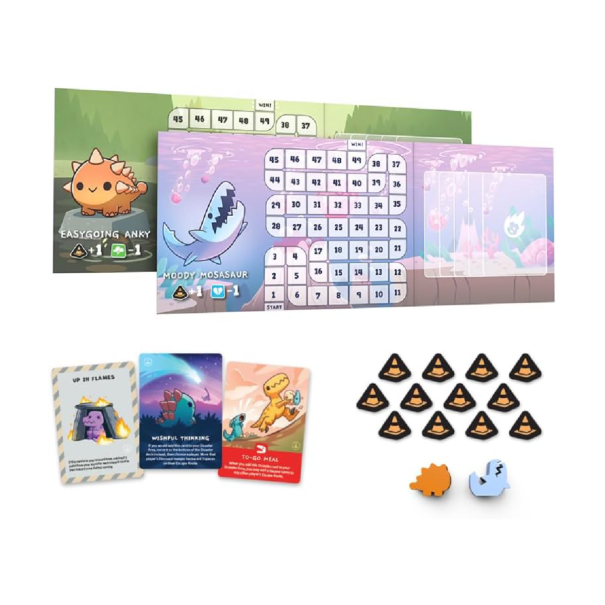 Pericoli all’Orizzonte espansione per il Gioco da Tavolo Happy Little Dinosaurs! Pericoli all’Orizzonte gioco da tavolo per 2-6 giocatori dagli 8 anni in su dalla durata di circa 30-60 minuti. La NUOVA espansione Happy Little Dinosaurs: Pericoli all’Orizzonte rivoluziona il gameplay con Pericoli (come se non bastassero già meteoriti e tagli di capelli orribili). Aggiungendo certe carte Disastro alla tua Area Disastro, potrai aggiungere un segnalino Pericolo al Percorso di Fuga di un altro giocatore! Quando il meeple del dinosauro di un giocatore raggiunge uno spazio con un segnalino Pericolo, quel giocatore deve aggiungere la prima carta del mazzo Pericolo scoperta alla propria Area Pericolo. Le carte Pericolo presentano un effetto che dà svantaggi ai giocatori durante tutto il gioco. (Le carte Pericolo rimangono nella tua Area Pericolo a meno che un effetto di carta ti permetta di rimuoverle.) Il caos ti attende acquista subito Pericoli all’Orizzonte – Happy Little Dinosaurs! Prendete il vostro elmetto, ci sono pericoli all’orizzonte! Questa espansione di Happy Little Dinosaurs contiene 2 nuovi personaggi e 3 nuovi componenti di gioco. I segnalini Pericolo possono obbligare i vostri avversari a prendere una temutissima carta Pericolo e affrontare misfatti del tutto nuovi. Le carte Giorno Fortunato vi aiuteranno a evitare i disastri che si presenteranno sul vostro cammino. Potreste trovarvi faccia a faccia con il Bigfoot oppure venire risucchiati dentro uno schema piramidale, quindi sperate fortemente che una stella cadente sia dietro l’angolo ad aspettarvi! Attenzione questo articolo è una espansione e richiede il gioco base Happy Little Dinosaurs per essere utilizzato. Se stai cercando il Happy Little Dinosaurs puoi trovarlo in fondo alla pagina. Happy Little Dinosaurs è un gioco di carte semplice e scorrevole con dinosauri pucciosissimi a cui non saprete sicuramente resistere! Vi capita mai di sentirvi come dinosauri che cercano di evitare meteoriti cadenti? In questo gioco da 2 a 4 giocatori, dovrete cercare di schivare tutti i disastri Naturali, Predatori ed Emotivi della vita. Potreste cadere dentro una fossa di lava incandescente, venire attaccati da scoiattoli dai denti a sciabola, oppure essere bidonati dal vostro dino-appuntamento… ma chi riuscirà a sopravvivere a tutto questo vincerà la partita! SCOPO DEL GIOCO HAPPY LITTLE DINOSAURS L’obiettivo del gioco da tavolo Happy Little Dinosaurs è semplice: la prima persona a raggiungere 50 punti, o l’ultimo dinosauro rimasto in gioco, vince. Durante ogni turno, girerai una carta Disastro che potrà essere Naturale, Predatorio o Emozionale. Ogni giocatore giocherà una carta Punto nella speranza di raccogliere punti ed evitare il disastro. Lavorerai per evitare tutti i piccoli disastri della vita e riderai quando accadranno ai tuoi amici. Se collezioni 3 carte Disastro dello stesso tipo O 3 tipi diversi di carte Disastro, sarai eliminato dal gioco. Le carte Punto presentano armi, ciondoli e portafortuna che utilizzerai per raccogliere punti ed evitare i disastri. Ogni carta ha un valore compreso tra 0 e 9 che userai durante il punteggio di un turno. Potrai utilizzare carte Istantanee in momenti diversi durante il gioco per inclinare le probabilità a tuo favore o salvare il tuo dinosauro da una morte certa. Le plance dei giocatori includono i tratti del tuo Dinosauro, una Via di Fuga che utilizzerai per tenere traccia del tuo punteggio e un’Area Disastro dove raccoglierai le carte Disastro. Muoverai il tuo pezzo del Dinosauro lungo la Via di Fuga sulla tua plancia giocatore per tenere traccia del tuo punteggio. Riuscirai a schivare con successo i disastri o sarai mangiato da una balena preistorica? Solo le carte possono decidere. Per maggiori informazioni sul gioco visita la pagina ufficiale dell’editore Asmodee! oppure dai un’occhiata alla pagina dedicata su Bgg! COME SI GIOCA AD HAPPY LITTLE DINOSAURS Le regole del gioco Happy Little Dinosaurs sono chiare e semplice da imparare: A ogni round, viene girata una carta Disastro e i giocatori giocheranno carte Punto dalle loro mani. Il punteggio viene calcolato partendo dal valore della carta Punto ma può aumentare o diminuire in base ai bonus o effetti di altre carte. Il giocatore con il punteggio minore ottiene la carta Disastro di quel round. Non appena si arriva a tre carte Disastro, tutte uguali o tutte diverse, nella propria area, si è eliminati dal gioco! A ogni round, i giocatori giocheranno carte Punto dalle loro mani al fine di ottenere più punti degli altri giocatori ed evitare disastri. Per iniziare un round, girate la carta in cima al mazzo Disastro a faccia in su e leggetela ad alta voce. Ogni giocatore deve scegliere una carta Punto dalla propria mano e collocarla a faccia in giù. Se un giocatore non ha alcuna carta Punto nella sua mano durante questo passo del round, quel giocatore deve scartare la sua mano e pescare 5 nuove carte (e ripetere il processo finché non ha una carta Punto che può giocare a faccia in giù). Dopo che tutti i giocatori hanno collocato una carta Punto a faccia in giù, tutti i giocatori rivelano le proprie carte Punto contemporaneamente. In ogni round, il calcolo del punteggio avviene dopo che tutti i giocatori hanno rivelato le proprie carte. Il punteggio base di un giocatore in un round è dato dal valore in punti della carta Punto a faccia in su che ha di fronte sé, ma quel punteggio può aumentare o diminuire in base ai bonus dati dai Tratti Dinosauro, agli effetti delle carte Punto e agli effetti delle carte Istantanee (che saranno spiegate nelle sezioni seguenti). Attenzione: solo il giocatore che ha totalizzato il punteggio maggiore del round ottiene un ammontare di punti pari al punteggio ottenuto e può quindi muovere la sua pedina Dinosauro lungo la Via di Fuga di quell’ammontare di caselle. Il giocatore con il punteggio minore aggiunge la carta Disastro a faccia in su alla sua Area Disastro. Se 