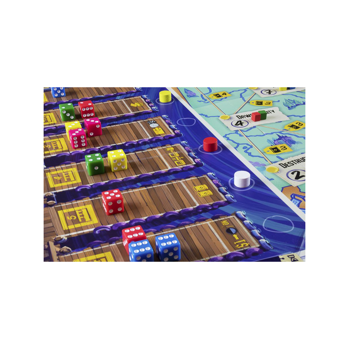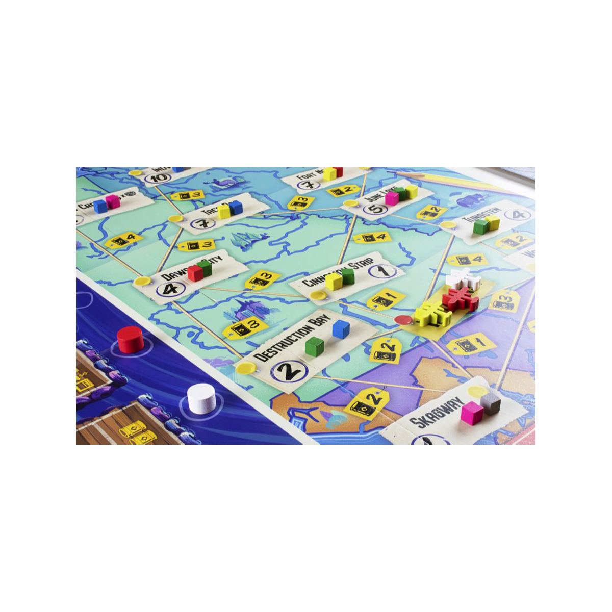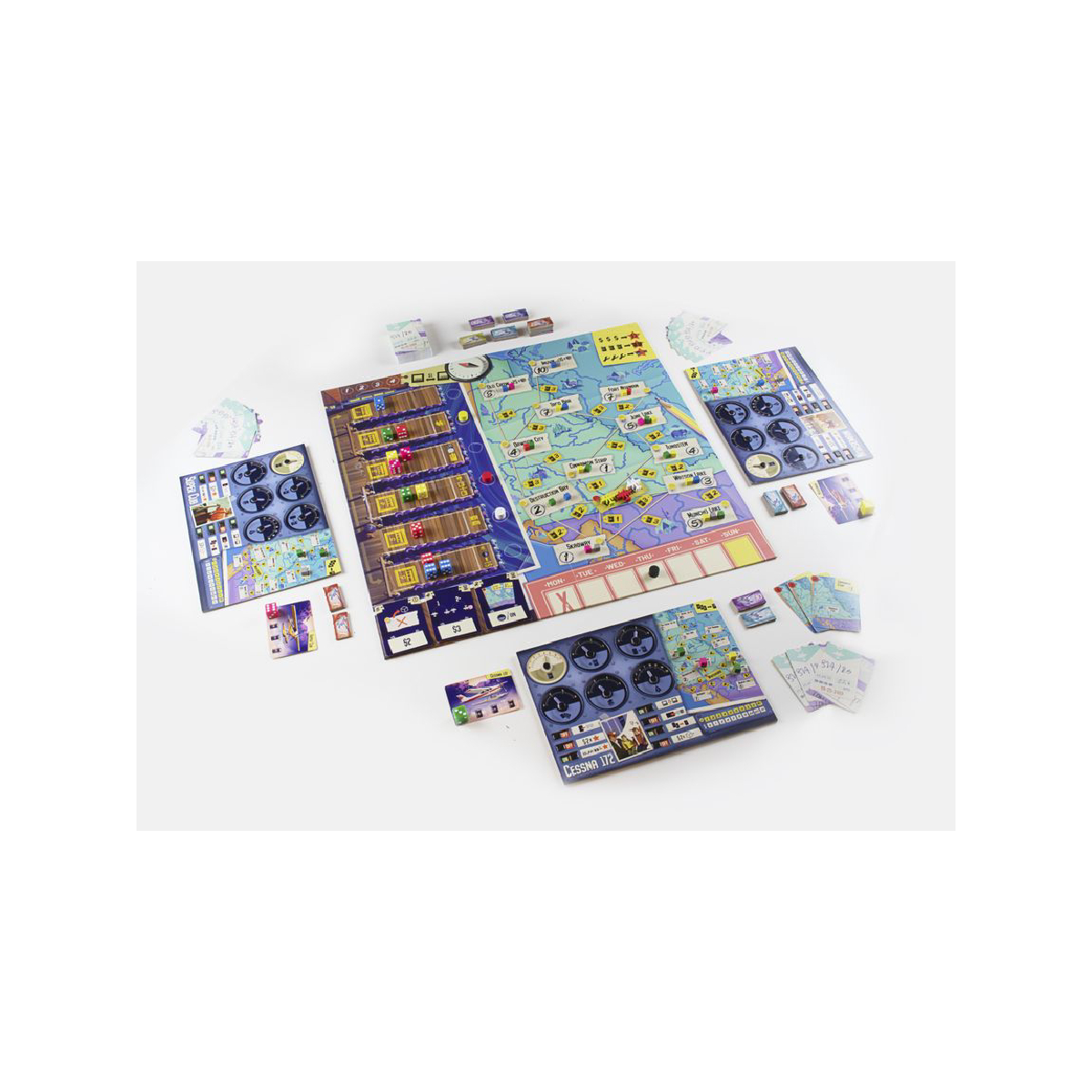 Pilota il tuo idrovolante e accompagna i turisti alla scoperta delle selvagge terre dello Yukon! E’ l‘estate del 1979 e i viaggiatori stanno facendo la coda sulle rive del lago Schwatka a Whitehorse, nell’impaziente attesa di vistare uno degli ultimi posti selvaggi della Terra: lo Yukon. Mettiti ai comandi del tuo Idrovolante e porta questi avventurieri alla scoperta della terra del Sole di Mezzanotte. Yukon Airways è un gioco per 1-4 giocatori, 60-90 minuti, 12+. Imbarca i tuoi passeggeri (dadi) attraverso un sistema di draft e utilizza le tue Carte Biglietto per portarli in differenti luoghi sulla mappa. Ogni passeggero che porterai ti darà soldi e la possibilità di migliorare il tuo Idrovolante come più si adatta alla tua strategia. Il giocatore che farà più soldi alla fine della settimana sarà il vincitore. La Yukon Airways originariamente iniziò come una piccola compagnia charter nel 1927, quando Andrew Cruickshank acquistò l’idrovolante Queen of Yukon. L’ aereo era un mezzo fondamentale per poter collegare e trasportare beni di necessità da una città all’altra in quella impervia regione canadese. Nel 1979 circa il padre di Al Leduc, creatore di questo gioco, era proprietario e operatore di questa compagnia aerea: le memorie ed i ricordi dell’autore, sono quindi state fedelmente ricreate per poter essere vissute dai giocatori. COME SI GIOCA A YUKON AIRWAYSIn Yukon Airways, sarai ai comandi del tuo idrovolante con la missione di trasportare viaggiatori verso i vari punti dello Yukon. Imbarca i passeggeri (dadi) utilizzando un sistema di selezione e usa le tue carte biglietto per portarli ai diversi luoghi sulla mappa. Per ogni passeggero, ottieni denaro e la possibilità di migliorare il tuo aereo se il passeggero trova un punto di interesse che soddisfa i loro gusti alla destinazione (quando il colore del dado corrisponde al colore di uno dei cubi in quella destinazione). Alla fine del gioco, guadagnerai denaro extra in base ai diversi luoghi che hai visitato. Il giocatore che ha guadagnato più denaro alla fine della settimana vince. Contenuto 1 Plancia Principale 72 Carte Biglietto 60 Tessere Moneta 4 Plance Giocatore 9 Carte Obiettivo 1 Segnalino Round Nero 15 Dadi 4 Carte Idrovolante 80 Cubetti 4 Segnalini Giocatore 4 Pedine Idrovolante 4 Carte Riassuntive (in inglese) 24 Lancette 28 Segnalini Interruttore 1 Regolamento Sleeves 89 63,5×88