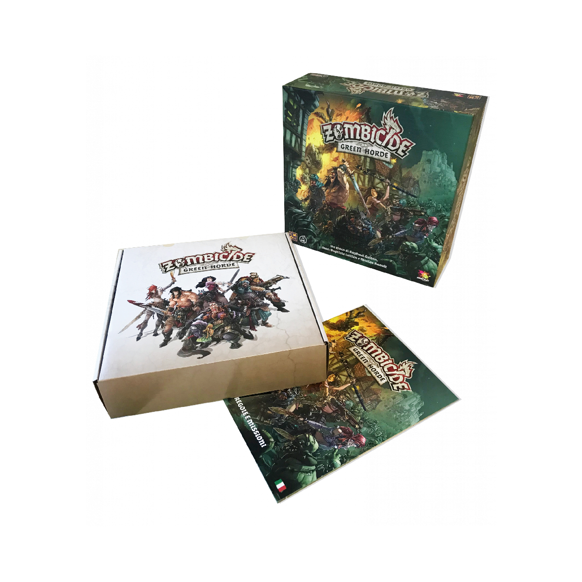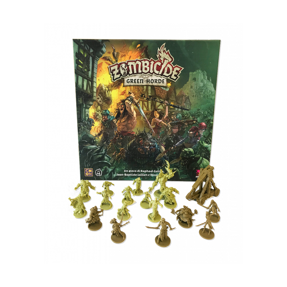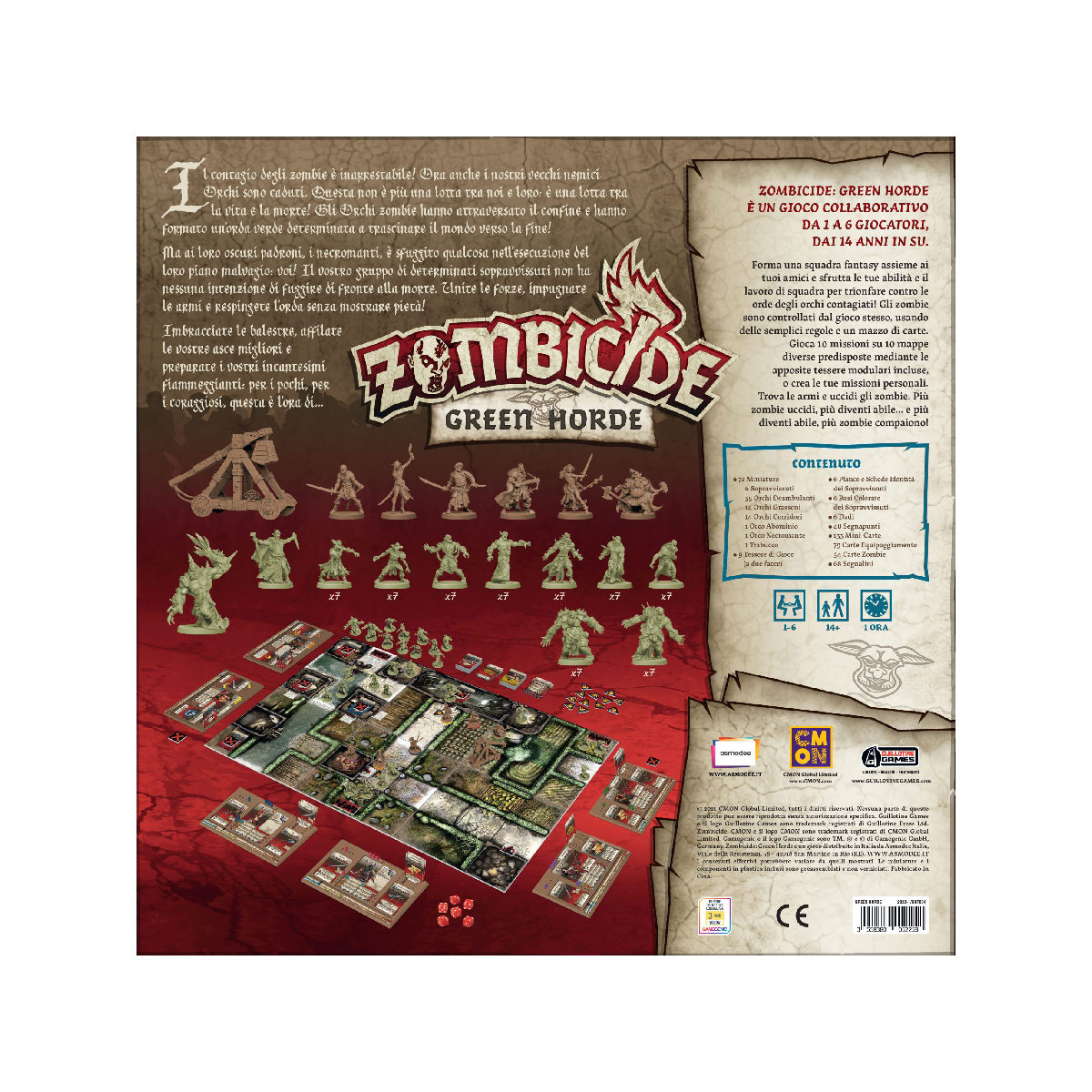 Zombicide Green Horde gioco cooperativo fine a sei giocatori a scenari in cui controllerete un gruppo di sopravvissuti in un’ambientazione fantasy medievale e combatterete per liberare la terra da un’invasione di orchi zombie, controllata dal gioco stesso. Il gioco Green Horde sequel di Zombicide Black Plague riporterà i giocatori in un mondo di mortale fantasia medievale, questa volta pieno di orchi e goblin infetti che metteranno alla prova gli sopravvissuti. Questa minaccia verde non solo è più forte dei loro simili umani, ma tende anche a riunirsi in masse enormi che tendono agguati agli sopravvissuti quando meno se lo aspettano. LINEA FANTASY ZOMBICIDE Il contagio degli zombie è inarrestabile! Ora anche i nostri vecchi nemici Orchi sono caduti. Questa non è più una lotta tra noi e loro: è una lotta tra la vita e la morte! Gli Orchi zombie hanno attraversato il confine e hanno formato un’orda verde determinata a trascinare il mondo verso la fine! Ma ai loro oscuri padroni, i necromanti, è sfuggito qualcosa nell’esecuzione del loro piano malvagio: voi! Il vostro gruppo di determinati sopravvissuti non ha nessuna intenzione di fuggire di fronte alla morte. Unite le forze, impugnate le armi e respingete l’orda senza mostrare pietà! Imbracciate le balestre, affilate le vostre asce migliori e preparate i vostri incantesimi fiammeggianti: per i pochi, per i coraggiosi, questa è l’ora di Zombicide Green Horde! Nel gioco da tavolo Zombicide Green Horde forma una squadra fantasy assieme ai tuoi amici e sfrutta le tue abilità e il lavoro di squadra per trionfare contro le orde degli orchi contagiati! Gli zombie sono controllati dal gioco stesso, usando delle semplici regole e un mazzo di carte. Gioca 10 missioni su 10 mappe diverse predisposte mediante le apposite tessere modulari incluse, o crea le tue missioni personali. Trova le armi e uccidi gli zombie. Più zombie uccidi, più diventi abile… e più diventi abile, più zombie compaiono! Zombicide Green Horde gioco indipendente che prevede un’ambientazione fantasy, così come Zombicide Black Plague, con cui è perfettamente compatibile! Preferite un’ambientazione urbana? Giocate con Zombicide 2a Edizione. Se invece preferite avventurarvi nel futuro con la linea fantascientifica, Zombicide Invader è quel che fa per voi! In questo gioco Zombicide Orchi ambientato nella stessa era medievale di Black Plague, i giocatori assumeranno il ruolo di Sopravvissuti desiderosi di sconfiggere la minaccia di non morti che si muove barcollante, in qualsiasi modo possibile. Il Medioevo di Zombicide Green Horde gioco da tavolo ti permette di affrontare non sono solo zombie umani, sono orchi zombie! I Sopravvissuti dovranno equipaggiarsi con una vasta gamma di attrezzature medievali se sperano di resistere a questi formidabili nemici. Gli Orchi Zombie sono più forti del classico zombie e rappresentano una sfida più impegnativa anche per i veterani cacciatori di non morti. Con nuovi avversari così minacciosi, i Sopravvissuti avranno le mani piene a fronteggiare la Green Horde. Fortunatamente, avranno anche alcune nuove armi e incantesimi dalla loro parte per combattere le masse marcescenti. Cose come il Lava Burst, la Norse Sword e il Bone Kukri saranno tutte utili quando si taglia attraverso una folla di non morti. Oh, e se dovessero radunarsi troppo strettamente, i Sopravvissuti possono sempre colpirli con la catapult…(non l’abbiamo menzionata prima?). Le regole classiche di Zombicide sono state rivisitate per questa nuova incarnazione del gioco, mantenendo comunque l’azione incessante, l’atmosfera tesa e le regole facili da imparare che hanno reso Zombicide un classico. Equipaggia il tuo sopravvissuto con armature come maglie di catena o scudi per difendersi dagli non morti, prendi libri degli incantesimi per eseguire incantesimi fantastici o accendi una pozza di bile di drago per creare un inferno divoratore di fuoco da drago! Il gioco da tavolo Zombicide Green Horde include dieci nuove missioni impegnative, con alcuni degli scenari più difficili che un Sopravvissuto abbia mai dovuto affrontare. Con nuovi terreni, come cornici e pozze d’acqua, e la costante minaccia della comparsa della Green Horde, il team dovrà pianificare con attenzione i loro percorsi. A volte evitare guai è meglio che affrontarli di petto! ZZombicide Green Horde è il prossimo capitolo nel mondo in continua evoluzione di Zombicide. Non c’è riposo per i Sopravvissuti se sperano di lottare per una nuova speranza e un nuovo inizio. Se volete, potete mescolare alcuni materiali delle due linee di Zombicide per creare la vostra ambientazione personale (qualcuno ha parlato di “bastoni tonanti”?). Tuttavia, molte regole sono cambiate per impartire a Zombicide Black Plague un gusto speciale! SCOPO DEL GIOCO ZOMBICIDE GREEN HORDE Lo scopo del gioco Zombicide Green Horde è semplicemente quello di completare gli obiettivi della Missione, sopravvivere e uccidere il maggior numero possibile di Zombie! Una nuova sfida per i Sopravvissuti è la Folla. Rappresenta un gruppo crescente di zombie orchi pronti a entrare nel tabellone in un luogo inaspettato e tendere un’imboscata ai Sopravvissuti. Quando vengono pescate carte zombie con il simbolo della Folla, un ulteriore miniatura di zombie dello stesso tipo viene messa da parte, formando collettivamente la Folla. Saranno bloccati sul posto fino a quando non verrà pescata una carta “Entrate nella Folla!”, facendo apparire la Folla sul tabellone. Qualsiasi Sopravvissuto sorpreso da solo vicino a questa minaccia ambulante farebbe meglio a fare una veloce ritirata. I Sopravvissuti possono scambiarsi equipaggiamento e i giocatori possono definire una tattica comune. Soltanto tramite la collaborazione sarà possibile portare a termine gli obiettivi della Missione e sopravvivere. Combattere gli Zombie è divertente, ma sarà necessario anche salvare gli altri Sopravvissuti, trovare cibo e armi, scop