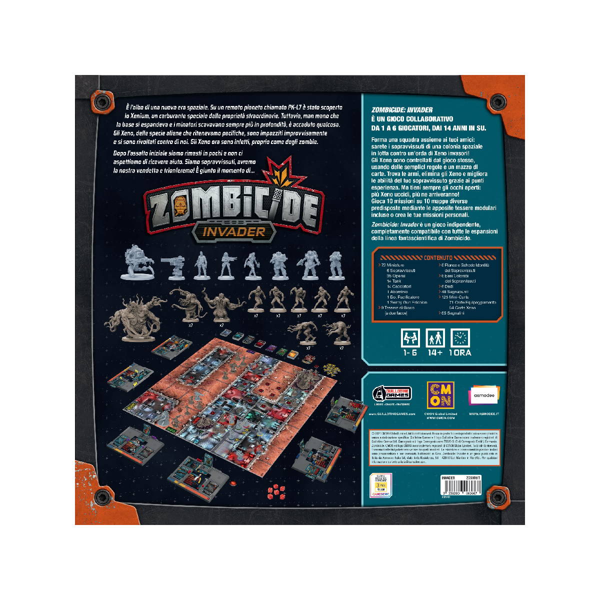 Zombicide Invader gioco collaborativo in cui i giocatori, da 1 a 6, affrontano un imperscrutabile sciame di alieni infetti controllati dal meccanismo stesso del gioco. Ogni giocatore controlla da 1 a 6 Sopravvissuti in un’ambientazione fantascientifica sopraffatta dagli Xeno. Lo scopo del gioco è semplicemente quello di completare gli Obiettivi della Missione, sopravvivere e uccidere il maggior numero possibile di Xeno! Nella maggior parte dei casi, gli Xeno sono prevedibili, ma ce ne sono molti, e spesso usano tattiche sporche. L’Abominio Corruttore, per esempio, secerne una sostanza aliena chiamata Melma all’interno del complesso spaziale per trasformarlo gradualmente in un nido di Xeno, diffondendo il pericolo ovunque. I Sopravvissuti usano tutto ciò su cui riescono a mettere le mani per uccidere gli Xeno e rallentare l’invasione. Migliori sono le armi che usano, più alto è il computo delle vittime e più numerosi sono gli Xeno che compariranno, attirati dal massacro! I Sopravvissuti possono essere Civili o Soldati e ognuno di essi è dotato di alcune Abilità specifiche. Giocano tutti nella stessa squadra, scambiandosi Equipaggiamento e coprendosi le spalle a vicenda. Soltanto tramite la collaborazione sarà possibile portare a termine gli Obiettivi della Missione e vincere. Combattere gli Xeno è divertente, ma sarà necessario anche salvare gli altri Sopravvissuti, recuperare dati cruciali, svelare oscuri segreti e altro ancora! Gli esseri umani si sono avventurati nello spazio alla ricerca di un carburante ad alta potenza e lo hanno trovato nell’angolo remoto dell’universo, sul piccolo pianeta PK-L7. La loro scoperta di Xenium, un composto scuro e oleoso nelle profondità del pianeta, è stata esattamente ciò che speravano. Ma hanno trovato anche qualcos’altro. L’attacco dei Xenos è stato brutale e implacabile. Mentre scienziati e soldati li hanno respinti nel miglior modo possibile, i Xenos continuano ad arrivare… SCOPO DEL GIOCO ZOMBICIDE INVADER Nel gioco da tavolo Zombicide Invader l’obiettivo è semplice: scegliere una missione, completare i suoi obiettivi, uccidere quanti più Xenos possibile e, soprattutto, sopravvivere! I sopravvissuti usano qualsiasi arma possano ottenere per uccidere i Xenos e rallentare l’invasione. Più potente è l’arma, più alto sarà il conto dei corpi, ma più Xenos appariranno, attratti dall’assalto! I sopravvissuti devono anche fare attenzione alla loro posizione, poiché le armi convenzionali funzionano bene al chiuso, ma sulla superficie priva di ossigeno del pianeta, avranno bisogno di armarsi con armi più specializzate. Laser, qualcuno? ZOMBICIDE ATTRAVERSO IL TEMPO E LO SPAZIO La linea di giochi di Zombicide consente ai giocatori di combattere contro gli Zombie in molte ambientazioni diverse, creando atmosfere di gioco uniche tramite Sopravvissuti, Zombie e altri elementi di gioco specifici. Usando le stesse meccaniche, tutte le scatole base di Zombicide sono concepite per introdurre il gioco ai nuovi giocatori. Le scatole base e le espansioni di una determinata era (classica, fantasy o fantascientifica) sono completamente compatibili tra loro. La linea classica di Zombicide è composta da 3 Stagioni che esplorano l’apocalisse Zombie nel mondo moderno in un arco di tempo che abbraccia all’incirca un anno. La linea fantasy di Zombicide porta i giocatori nei Secoli Bui per fronteggiare i piani malvagi dei folli Necromanti che hanno scatenato contro il paese i loro eserciti di Zombie. Voi e i vostri compagni Sopravvissuti combatterete per un futuro migliore! Zombicide Invader gioco da tavolo cooperativo indipendente a scenari in cui controllerete un gruppo di sopravvissuti in un’ambientazione futuristica e combatterete contro uno sciame di alieni infetti, controllati dal gioco stesso. LINEA FANTASCIENTIFICAÈ l’alba di una nuova era spaziale. Su un remoto pianeta chiamato PK-L7 è stato scoperto lo Xenium, un carburante speciale dalle proprietà straordinarie. Tuttavia, man mano che la base si espandeva e i minatori scavavano sempre più in profondità, è accaduto qualcosa. Gli Xeno, delle specie aliene che ritenevamo pacifiche, sono impazziti improvvisamente e si sono rivoltati contro di noi. Gli Xeno ora sono infetti, proprio come degli zombie. Dopo l’assalto iniziale siamo rimasti in pochi e non ci aspettiamo di ricevere aiuto. Siamo sopravvissuti, avremo la nostra vendetta e trionferemo! È giunto il momento di Zombicide Invader! Forma una squadra assieme ai tuoi amici: sarete i sopravvissuti di una colonia spaziale in lotta contro un’orda di Xeno invasori! Gli Xeno sono controllati dal gioco stesso, usando delle semplici regole e un mazzo di carte. Trova le armi, elimina gli Xeno e migliora le abilità del tuo sopravvissuto grazie ai punti esperienza. Ma tieni sempre gli occhi aperti: più Xeno uccidi, più ne arriveranno! Gioca 10 missioni su 10 mappe diverse predisposte mediante le apposite tessere modulari incluse o crea le tue missioni personali. Questa scatola del gioco Zombicide Invader prevede un’ambientazione futuristica. Preferite un’ambientazione urbana? Giocate con Zombicide 2a Edizione. Se invece preferite un’ambientazione fantasy, giocate con Zombicide Black Plague o Zombicide Green Horde! Tutti i prodotti della linea fantascientifica sono compatibili tra di loro. In questa variante fantasy di Zombicide, i giocatori affrontano uno sciame di alieni infetti controllati dal meccanismo stesso del gioco.Lo scopo del gioco è semplicemente quello di completare gli Obiettivi della Missione, sopravvivere e uccidere il maggior numero possibile di Xeno! COME SI GIOCA A ZOMBICIDE INVADER Lo scopo del gioco Zombicide Invader è scegliere una Missione e completarne l’Obiettivo uccidendo il maggior numero possibile di Zombie lungo il percorso. Questi mostri arriveranno in numeri sempre maggiori man mano che l’Adrenalina salirà, minacciando di sopraffare i Sopravvissuti, che faranno b
