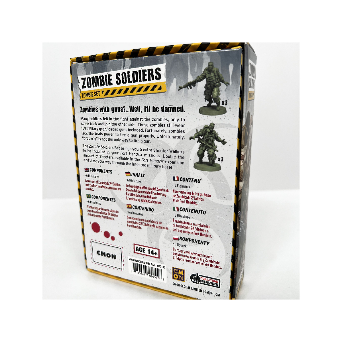Zombie Soldiers Espansione per Fort Hendrix – Zombicide 2a Ed. Il set Zombie Soldiers espansione Fort Hendrix ti offre 6 Deambulanti Tiratori extra da includere nelle tue missioni di Fort Hendrix. Con questo Zombie set per Zombicide raddoppia la quantità di Tiratori disponibili e fatti strada attraverso la base militare infetta! Molti soldati caddero nella lotta contro gli zombi, solo per tornare e unirsi al lato opposto. Questi zombi indossano ancora un completo equipaggiamento militare, pistole cariche incluse. Fortunatamente, gli zombi mancano della capacità cerebrale per sparare correttamente una pistola. Sfortunatamente, “correttamente” non è l’unico modo per sparare una pistola. Questo articolo è un espansione e richiede il gioco base Zombicide Seconda Edizione e l’espansione Fort Hendrix per essere utilizzato. INFORMAZIONI SUL GIOCO BASE ZOMBICIDE Zombicide Seconda Edizione gioco cooperativo a scenari. Giocate assieme ai vostri amici formando una squadra di Sopravvissuti a un’invasione di Zombie in un mondo ispirato ai film horror e d’azione! Gli Zombie sono controllati dal gioco stesso, usando alcune semplici regole e un mazzo di carte. Trovate le carte, uccidete gli Zombie e accumulate adrenalina con i vostri Sopravvissuti per sviluppare tutto il loro potenziale. Più Zombie uccidete, più ne arriveranno! La Seconda Edizione di Zombicide contiene regole aggiornate e riorganizzate, e materiali tratti dai set classici di Zombicide. Scegliete tra 12 Sopravvissuti (6 Adulti, 6 Ragazzini), formate la vostra squadra perfetta e tuffatevi nella frenesia e nell’azione di 25 Missioni composte usando le tessere modulari della mappa. Cosa cambia rispetto alla precedente?Un regolamento corretto e migliorato, un setup più pratico e veloce, l’aggiunta di modalità diverse, ancora più scenari.Cosa ritroverete?Lo stesso stile unico e inconfondibile. Zombicide gioco da tavolo che ha conquistato il mondo con oltre due milioni di copie vendute dal suo lancio nel 2012 e ha generato una franchise di culto di sterminatori cooperativi di zombie in tutto il mondo. Nel gioco Zombicide, gli zombie sono controllati dal gioco, mentre i giocatori assumono il ruolo di sopravvissuti che devono cooperare per sopravvivere e prosperare in un mondo invaso dai non morti assetati di sangue. Il gioco di società Zombicide 2a Ed. presenta regole raffinate e ottimizzate, comprese aggiornamenti alla priorità del bersaglio per gli attacchi a distanza, interazioni con le porte e meccanismi dei veicoli. È stata aggiunta anche una nuova funzionalità denominata “zona oscura”, una zona che nasconde gli zombie dagli attacchi dei sopravvissuti. Il gioco Zombicide 2a Ed. includerà anche nuovi componenti e miniature, tra cui cruscotti in plastica e nuovi sopravvissuti bambini. I giocatori che ritornano potranno utilizzare la loro collezione esistente dalle precedenti versioni di Zombicide. “Fino a poco tempo fa, molti di noi erano persone comuni che conducevano vite comuni, e i nostri sogni rientravano nei confini imposti dalla legge comune. Poi arrivarono gli zombie, cogliendo l ’ umanità di sorpresa. Gli infetti distrussero il vecchio mondo nel giro di pochi giorni. Di fronte all’apocalisse, alcuni di noi hanno mostrato il loro vero io e sono sopravvissuti facendo fuoco e fiamme. Non siamo più le persone che eravamo. Il passato è perduto. Ora siamo liberi di scegliere il nostro destino. Questo non diventerà un mondo di zombie. È l’ora della vendetta. È l’ora di Zombicide!” I temi principali del gioco di zombie Zombicide sono il lavoro di squadra, l’azione frenetica e il raggiungimento della vittoria contro probabilità impossibili. SCOPO DEL GIOCO ZOMBICIDE Lo scopo del gioco Zombicide Seconda Edizione è semplicemente quello di completare gli obiettivi della Missione, sopravvivere e uccidere il maggior numero possibile di Zombie! Zombicide Seconda Edizione prevede un’ambientazione urbana. Preferite un’ambientazione medievale? Giocate con Zombicide Black Plague o con Zombicide Green Horde. Se invece preferite avventurarvi nel futuro con la linea fantascientifica, Zombicide Invader è quel che fa per voi! COME SI GIOCA A ZOMBICIDE Lo scopo del gioco Zombicide è scegliere una Missione e completarne l’Obiettivo uccidendo il maggior numero possibile di Zombie lungo il percorso. Questi mostri arriveranno in numeri sempre maggiori man mano che l’Adrenalina salirà, minacciando di sopraffare i Sopravvissuti, che faranno bene a guardarsi le spalle a vicenda! I Sopravvissuti usano tutte le armi che riescono a trovare per uccidere gli Zombie e rallentare l’invasione. Migliore è l’arma, più alto è il computo delle vittime, più Zombie compariranno, attirati dal massacro! La vostra arma migliore, tuttavia, è la collaborazione. Tutti i giocatori vincono o perdono assieme e soltanto grazie al lavoro di squadra i Sopravvissuti potranno migliorare, sbloccare potenti Abilità e accedere alle armi migliori. La collaborazione è essenziale per la sopravvivenza e la vittoria! Il gioco Zombicide si svolge in una serie di Round che vedranno alternarsi due fasi:La FASE DEI GIOCATORI in cui i Sopravvissuti si attivano 1 alla volta con 3 Azioni per Turno, come muoversi, attaccare, cercare oggetti etc.La FASE DEGLI ZOMBIE dove tutti gli Zombie sul tabellone si attivano e attaccano, se possibile, un Sopravvissuto che si trova nella loro stessa Zona oppure, se non possono attaccare nessuno, si muovono verso i Sopravvissuti. La partita è vinta immediatamente quando tutti gli Obiettivi della Missione sono stati completati ma fate attenzione, se anche solo uno di voi ci lascerà le penne, avrete perso tutti! Questo articolo è un espansione e richiede il gioco base Zombicide Seconda Edizione e l’espansione Fort Hendrix per essere utilizzato. Davvero non ti basta? Scopri tutti gli articoli disponibili per Zombicide! Contenuto 6 Miniature Sleeves – Non Previste